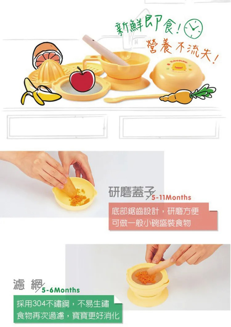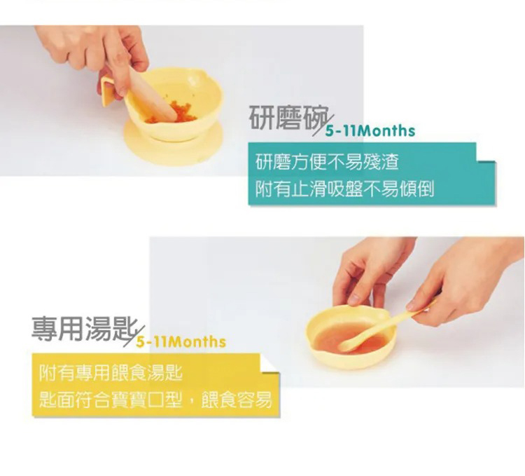 ・Grinder (suitable for 5-11 months): Convenient grinding with minimal residue sticking. When stacked for storage, the grinding stick can be placed in the circle on the grinder handle. The bottom features a suction cup to secure it and prevent tipping during grinding.